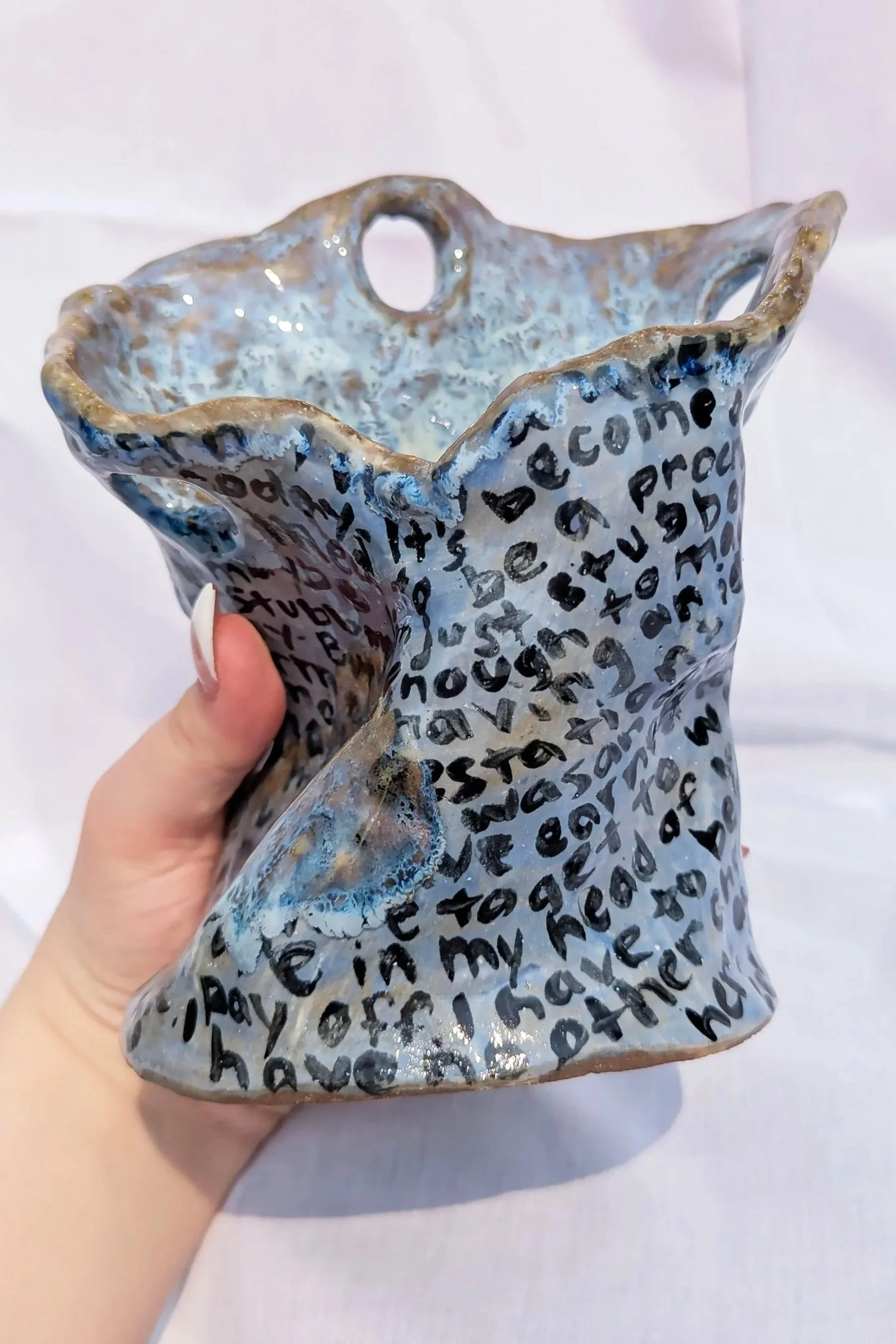 A handbuilt vessel shaped to fit perfectly between the grasp of my hands. The surface is covered with a stream of consciousness I wrote on April 14th, 2025. Clouds are painted with crystalline glaze around the vessel, obscuring my writing.04/14/25