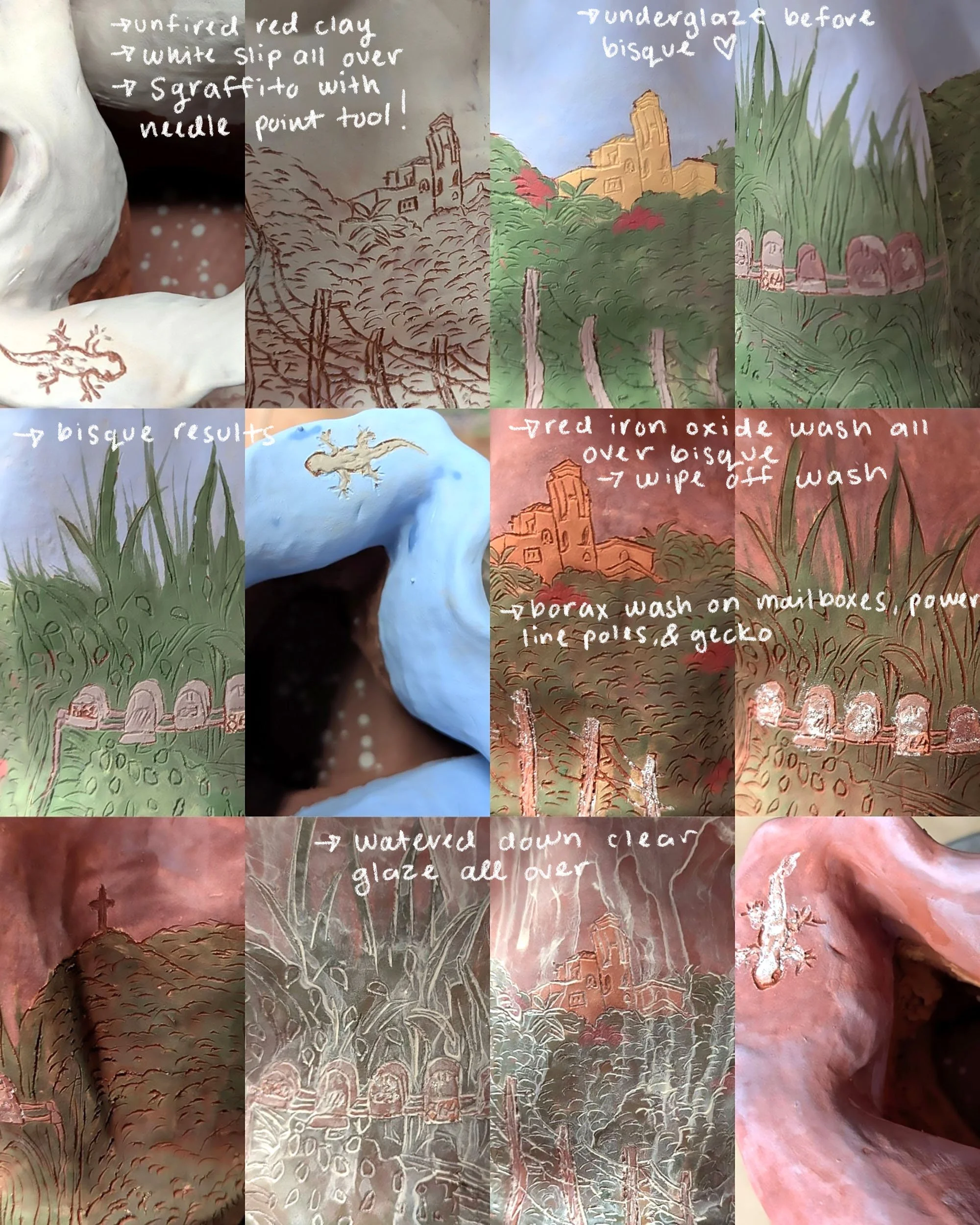 Red clay, white slip, underglaze, iron oxide wash, borax wash, clear glaze.